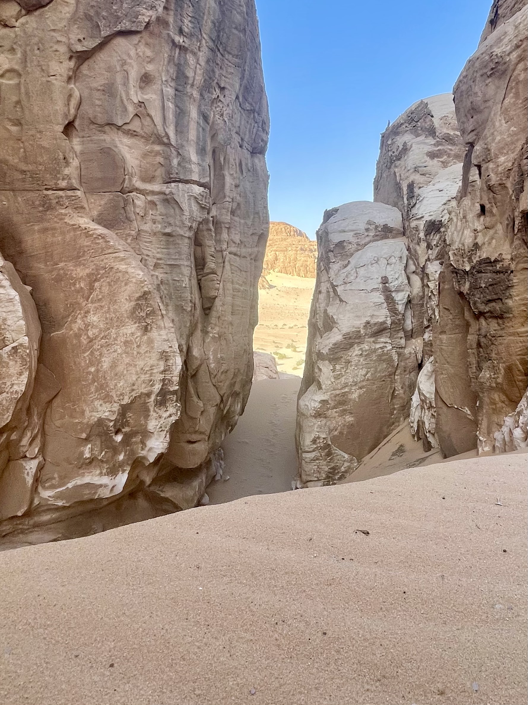 Au vu du poids global, nous revoyons l’objectif à 100 kilomètres en autonomie (plus si affinités…). Sur la carte vue satellite, la partie sud du Wadi-Rum me fait envie, avec notamment une zone longue vallée de 50 kilomètres sans échappatoire. Je dessine 100 kilomètres et j’en extrait la trace GPS. La veille nous cachons 2 réservoirs de 20 litres d’eau, au 40eme et au 80eme kilomètres, une pelle, un trou, du sable par dessus, … et mémorisation de l’endroit précis pour les retrouver !